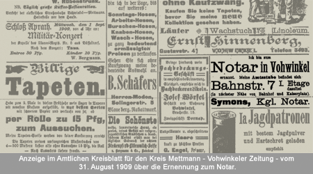 Nebeneffekt des Bemühens um ein eigenes Amtsgericht war jedoch, dass das Justizministerium Vohwinkel zumindest ein eigenes Notariat zugestand. Am 1. September 1909 nahm der erste Notar Vohwinkels, Justizrat Max Symons, in der Bahnstraße 7 seine Amtsgeschäfte auf.